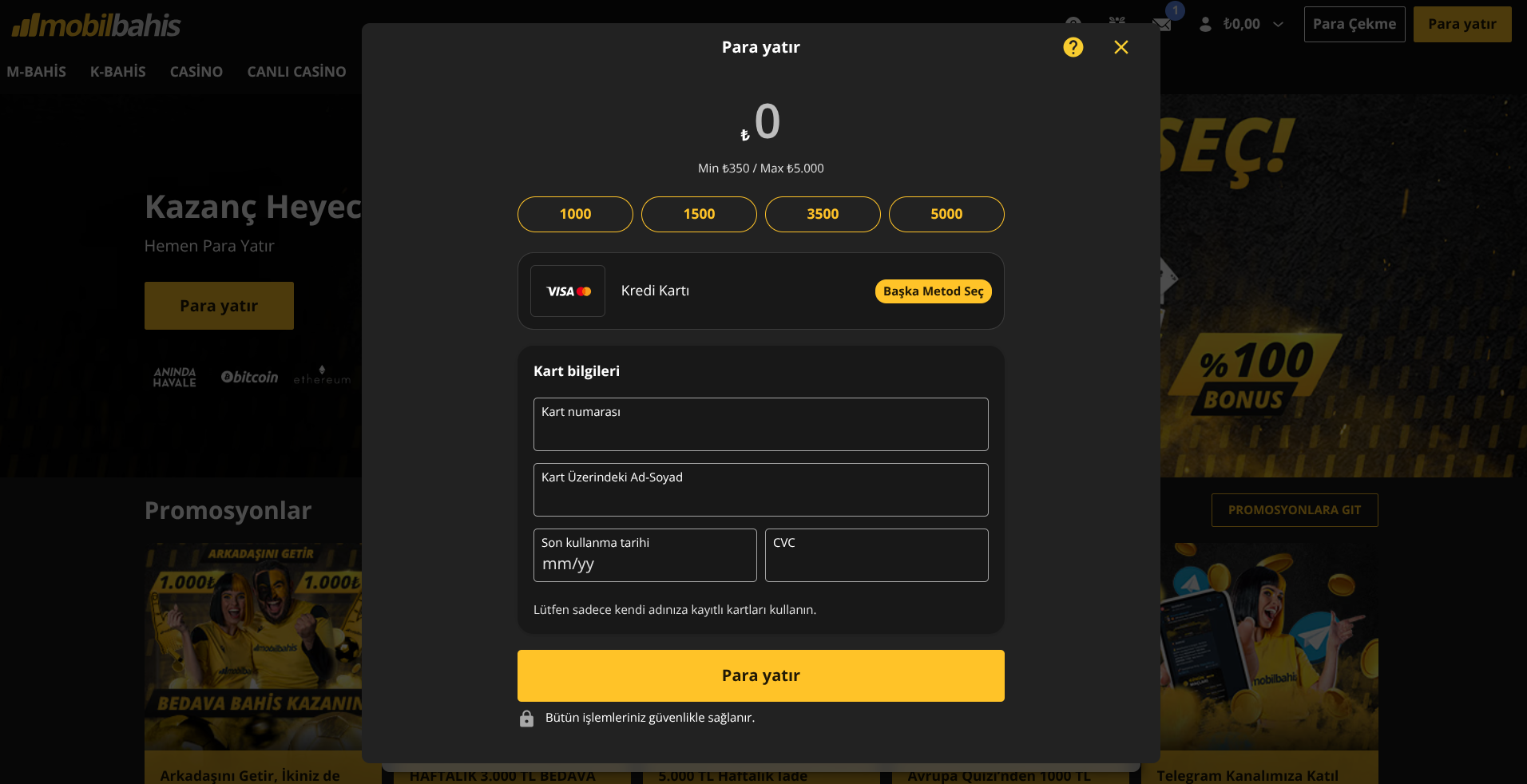 Kredi kartınızı kullanarak hesabınıza para yatırmak için öncelikle hesabınıza giriş yapın. Ardından “Para yatırma” seçeneğine tıklayın ve menüden Kredi Kartı (Visa, Master Card, Maestro vb.) yöntemini seçin.