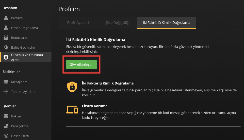 İlgili sayfada "2FA etkinleştir" seçeneğini seçerek İki Faktörlü Kimlik Doğrulama özelliğini aktif edebilirsiniz.